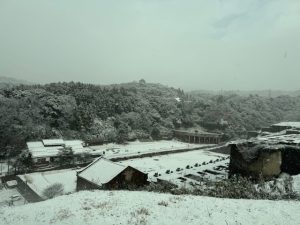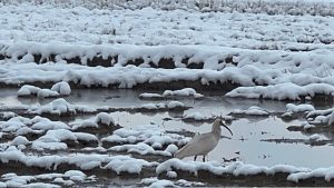 雪景色の中ではなかなか朱鷺を発見できません。薄桃色の朱鷺色の翼で舞い上がったときにはじめて朱鷺に気がつきます。